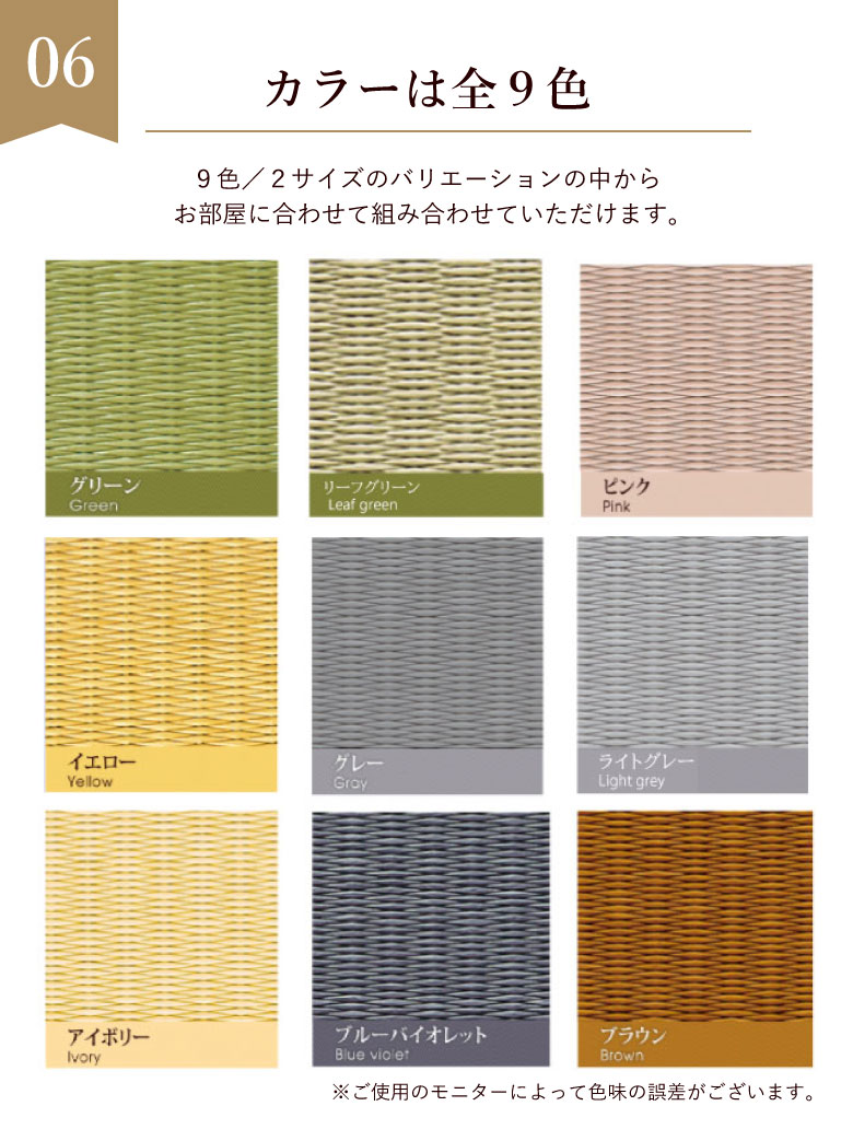洋間にも合わせ易いモダンなへりなし仕様です。畳表、芯材とも水に強い樹脂素材を使用しているので、丸洗い出来る畳です。丸洗いできるので、畳スペースを作りたいがペットを飼っているので使えない。子供がアトピーでダニ、カビの発生が心配な方におすすめです!一本一本表面を織っているのでべた付き感が殆どないのも特徴です。裏面は滑り止めになっておりフローリングの上でも安定します。クローゼットにも収納できるコンパクトな60cm角をご用意しました。※画像と実物で多少色が異なる場合がございます。予めご了承くださいませ。 |