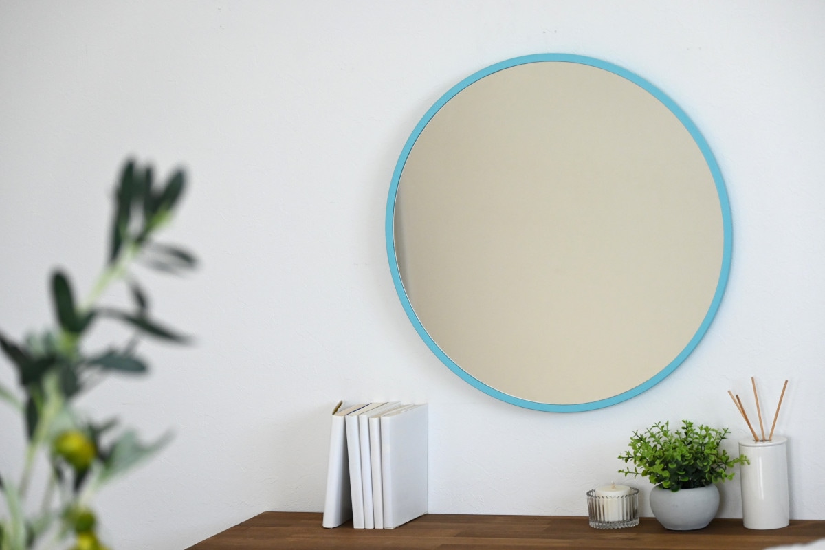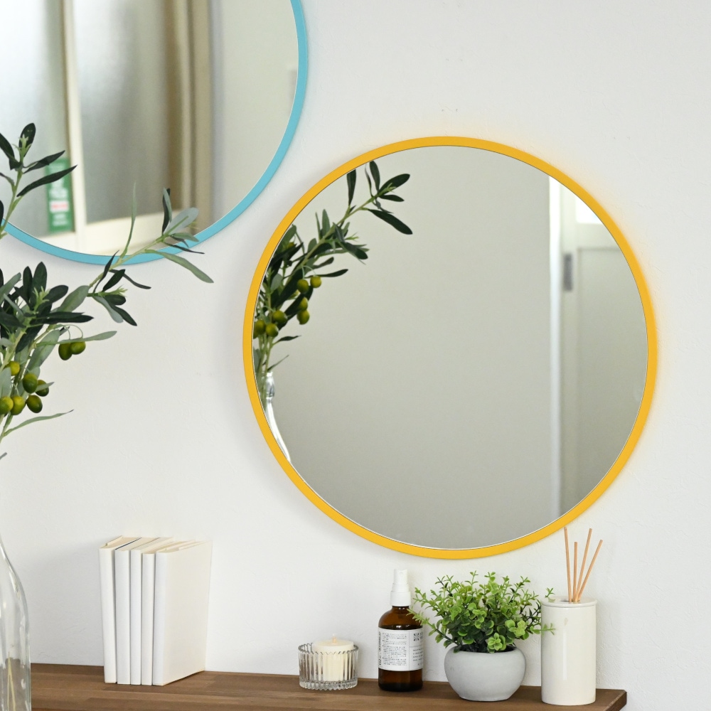 人は丸いものに安心感や優しさ・可愛らしさというイメージを持つようです。木枠幅1cmの丸形ミラーRondaは基本色に加えて、ブルー・ピンク・イエロー・グレーと色展開が豊富なのでそのイメージ通りの空間作りが可能です。